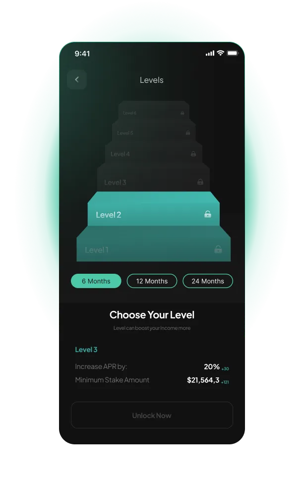 Discover KonnektVPN's "Levels" system, designed to help you earn more passive income on your investment. With smart contracts on the blockchain, your funds are securely locked, ensuring transparency and safety. Control your investments, enjoy automatic token releases, and watch your wealth grow effortlessly.